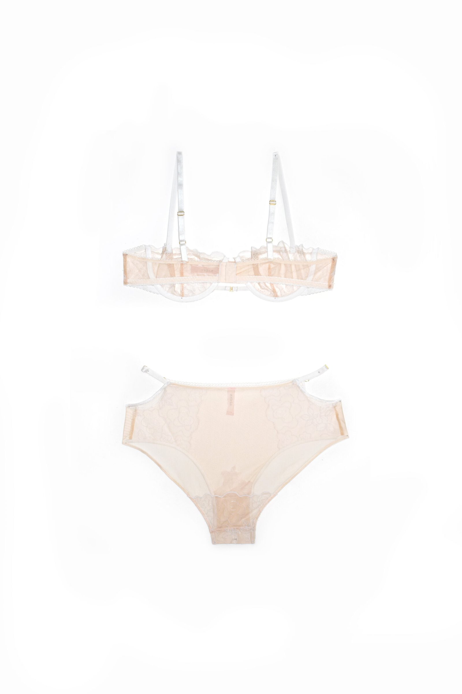 Amalia est un ensemble sophistiqué composé d’un soutien-gorge balconnet et d’une culotte haute assortie, entièrement confectionnés dans une broderie florale exclusive dessinée par mes soins et réalisée en collaboration avec la maison Broderie Levaux.